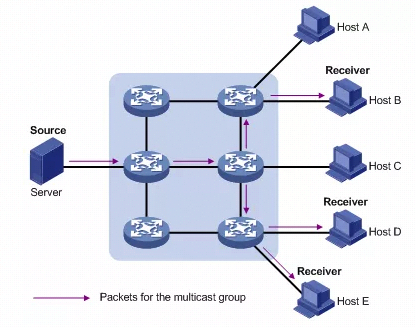 假设只有 Host B、Host D 和Host E 需要信息,采用组播方式时,可以让这些主机加入同一个组播组(Multicast group),组播源向该组播组只需发送一份信息,并由网络中各路由器根据该组播组中各成员的分布情况对该信息进行复制和转发,最后该信息会准确地发送给Host B、Host D 和Host E。