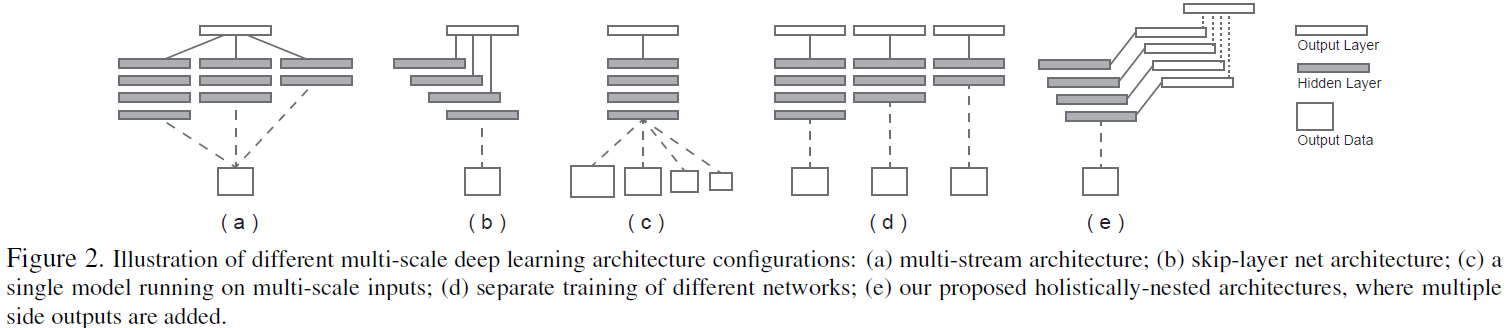 - Holistically-nested networks:本文提出的算法结构,从d)演化而来,类似一个相互独立的多网络多尺度预测系统,但是将multiple side outputs组合成一个单一深度网络。包含单一流网络,多面输出。集成deeply-supervised net工作,其隐藏层监督可以改善图像分类性能和鲁棒性。多面输出使增加额外融合层更加灵活。