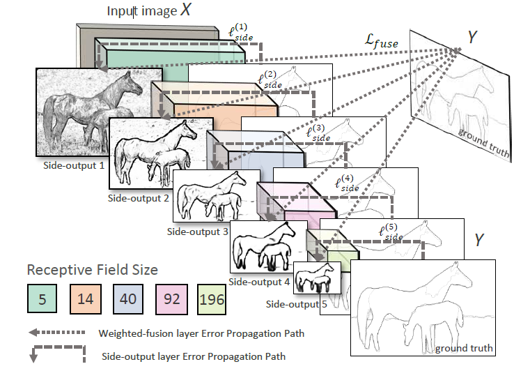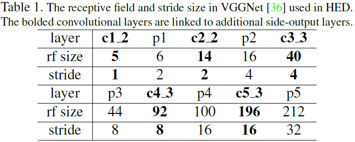 HED网络有5个阶段,stride分别为1,2,4,8,16,具有不同感受野尺寸,所有都内嵌在VGGNet。