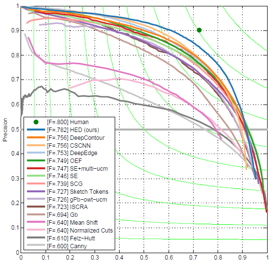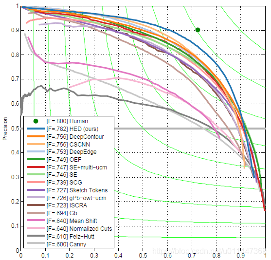 HED比其他深度学习方法有更高的召回率是因为deep supervision能考虑到low level predictions。