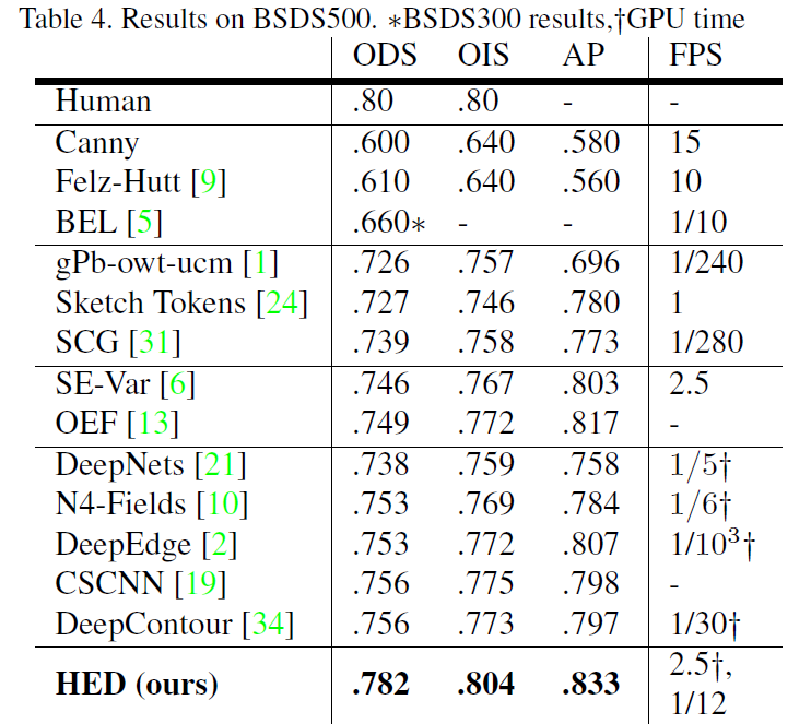 为了优化评价结果,我们使用在edge maps上使用标准的非极大值抑制方法来获取thinned edges。实验结果见Figure5和table4。如Figure5所示,本方法获得最佳结果,ODS=.782。