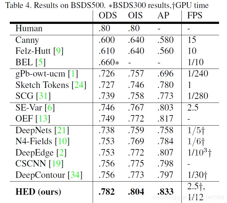 BSDS500数据集包括200训练集、100验证集、200测试集。评价三准则:fixed contour threshold (ODS), per-image best threshold(OIS), and average precision (AP)。