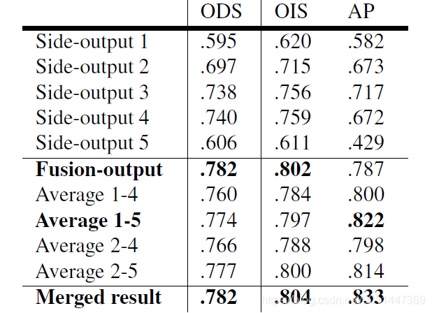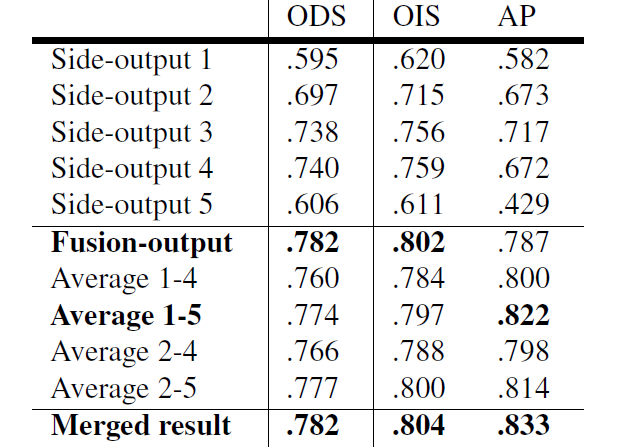 为了更明确的验证side outputs,table 3显示不同尺度上每个side outputs的结果,包括多尺度edge maps的不同结合。融合输出得到最佳F值,5层平均得到最佳平均准确性,合并二者得到最佳性能。注意所有side-output预测值都是one pass得到的。