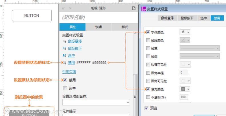 点击元件属性中各个交互样式的名称,即可设置元件在不同状态时呈现的样式。这些样式在交互被触发时,就会显示出来。)比如设置元件默认状态为禁用,在浏览原型时,页面打开后就会显示该元件被禁用的样式。