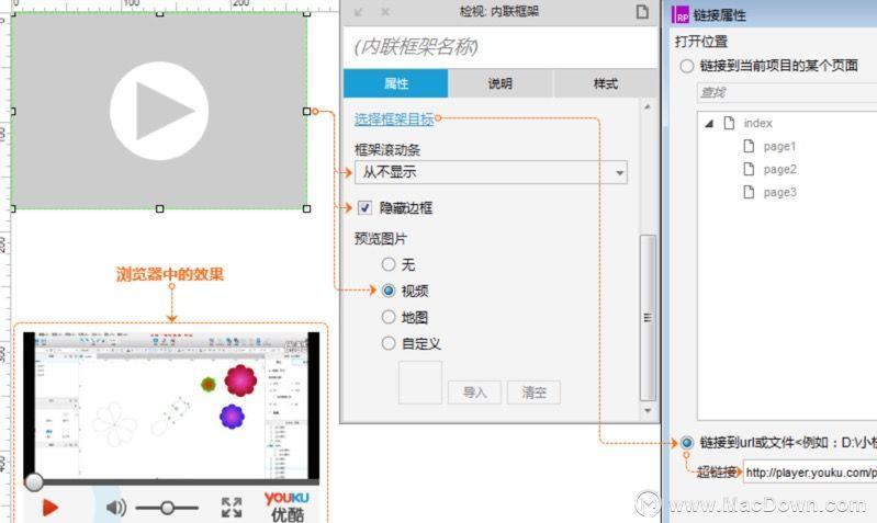 基本元件中的内联框架可以插入多媒体文件与网页。双击元件或者在属性中点击【框架目标页面】,在弹出的界面中选择【链接到url或文件】,填写{超链接},内容为多媒体文件的地址(网络地址或文件路径)或网页地址。在这个界面中也可以选择嵌入原型中的某个页面。