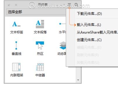除了使用软件自带的默认元件库与流程图元件库,用户还可以加载自定义元件库。加载自定义元件库只需点击功能图标,在列表中选择【载入元件库】。
