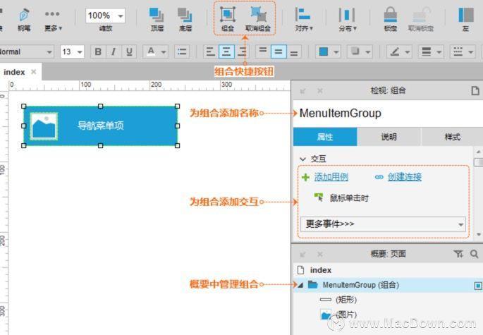 通过快捷功能图标或右键菜单可以将多个元件组合到一起,达到共同移动/选取/添加交互等操作。组合/取消组合的快捷键为< Ctrl(Com) G>键/键。