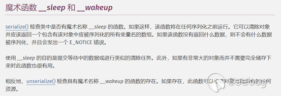 - __sleep() : serialize() 函数会检查类中是否存在一个魔术方法 __sleep()。如果存在,该方法会先被调用,然后才执行序列化操作。此功能可以用于清理对象,并返回一个包含对象中所有应被序列化的变量名称的数组。如果该方法未返回任何内容,则