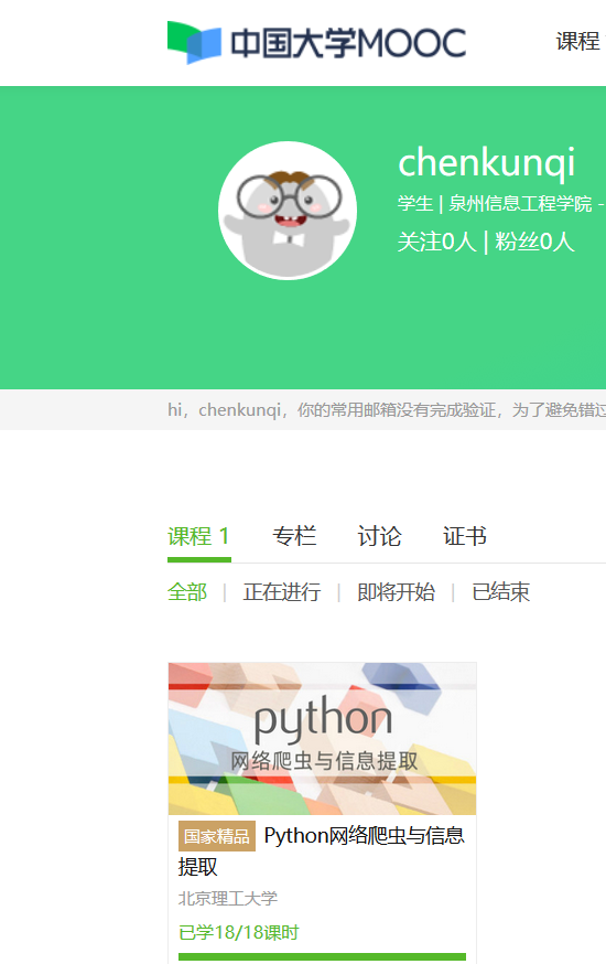 1.注册中国大学MOOC 2.选择北京理工大学嵩天老师的《Python网络爬虫与信息提取》MOOC课程 3.学习完成第0周至第4周的课程内容,并完成各周作业 4.提供图片或网站显示的学习进度,证明学习的过程。 5.写一篇不少于1000字的学习笔记,谈一下学习的体会和收获。 来源:https://www.cnblogs.com/kunqi/p/11770784.html 标签 大学