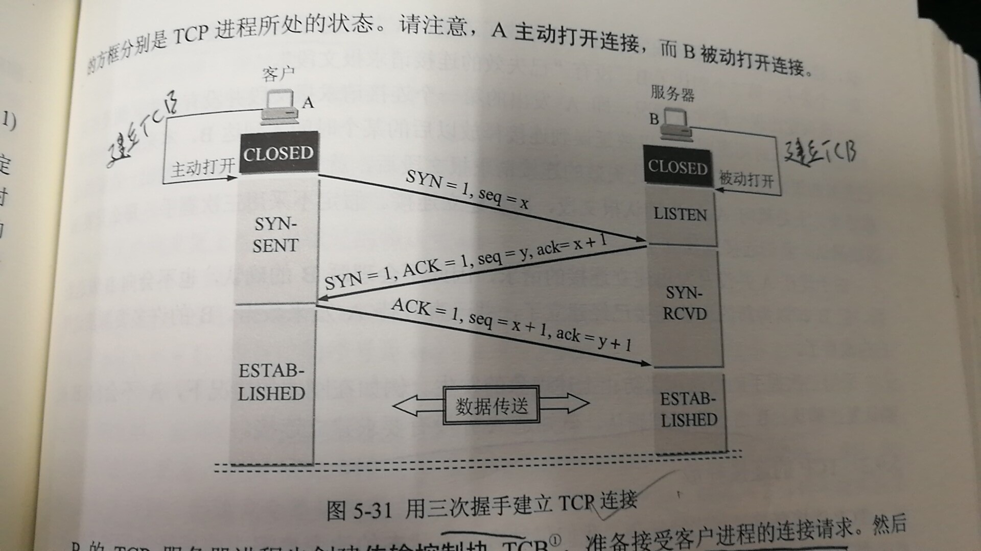 (1)最开始AB都处于close状态,A主动打开连接,B被动打开连接。B的TCP服务器进程先创建传输控制块TCB,准备接收客户进程的连接请求,然后服务器处于listen状态,等待客服的连接请求,如果有就做出响应。