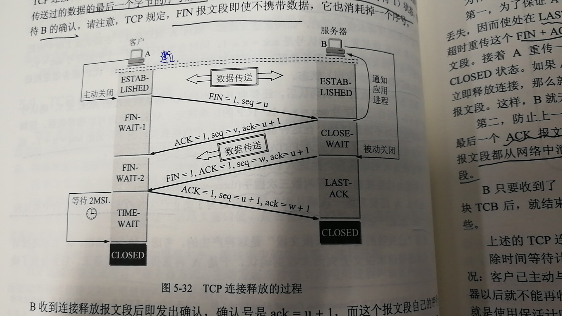 (7)服务器B只要收到了客户端A发出的确认,立即进入CLOSED状态。同样,B撤销TCB后,就结束了这次的TCP连接。可以看到,服务器结束TCP连接的时间要比客户端早一些。