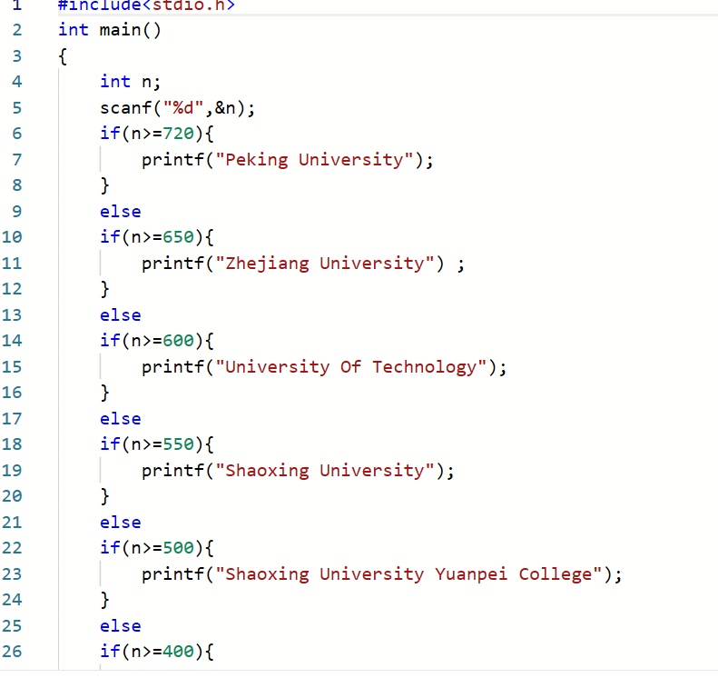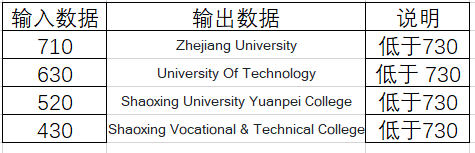 1.1高考结束不久,各校的入取分数线也出来了,北京大学(Peking University)720,浙江大学(Zhejiang University)650,工业大学(University Of Technology)600,文理学院(Shaoxing University)550,文理学院元培学院(Shaoxing University Yuanpei College)500,绍兴职业技术学院(Shaoxing Vocational & Technical College)400,张三的分数为n,请问张三能去哪个大学? 如果分数低于400,则回家种地(to be a farmer)。很多学生都想知道自己能去哪个学校,求身为程序员的你帮帮他们。