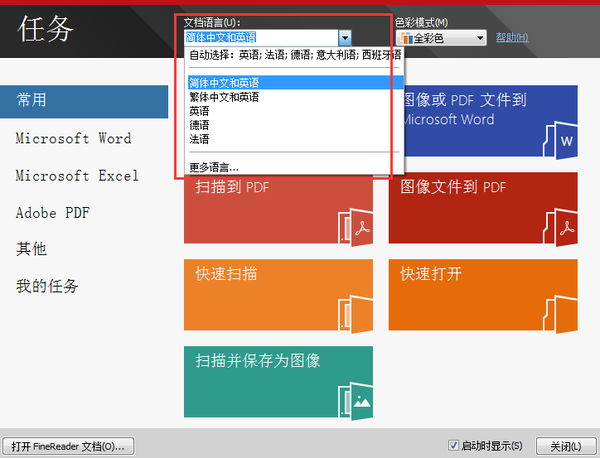 1、打开ABBYY FineReader 12主界面,找到“文档语言”,在满足条件的情况下选择尽可能少的语言,这样就可以降低识别产生的错误。