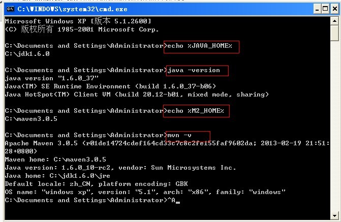 打开命令提示符(开始---运行---cmd),检查我们的java环境和maven环境是否有误。