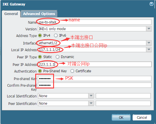 2. 使用配置信息定义 IKE 网关,这些配置用于与对端网关进行 IKE 协议协商。
