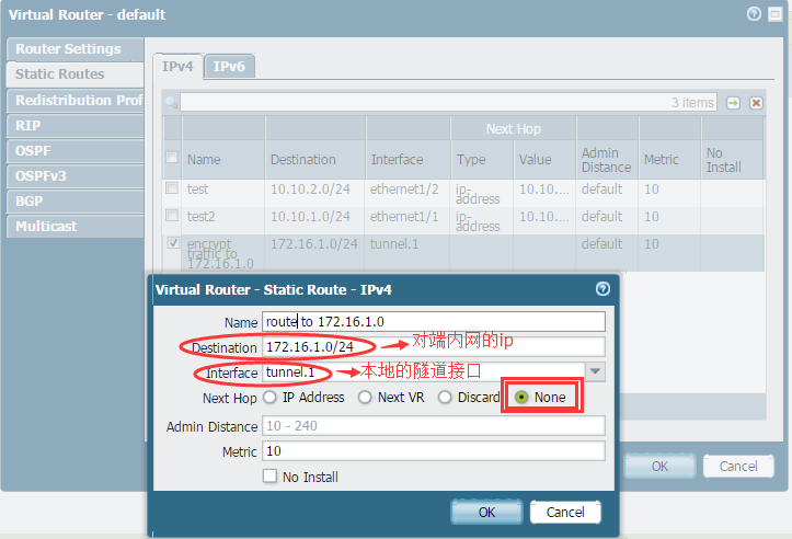 6. 设置静态路由或指定路由协议,以将通信重定向到新建的隧道中。