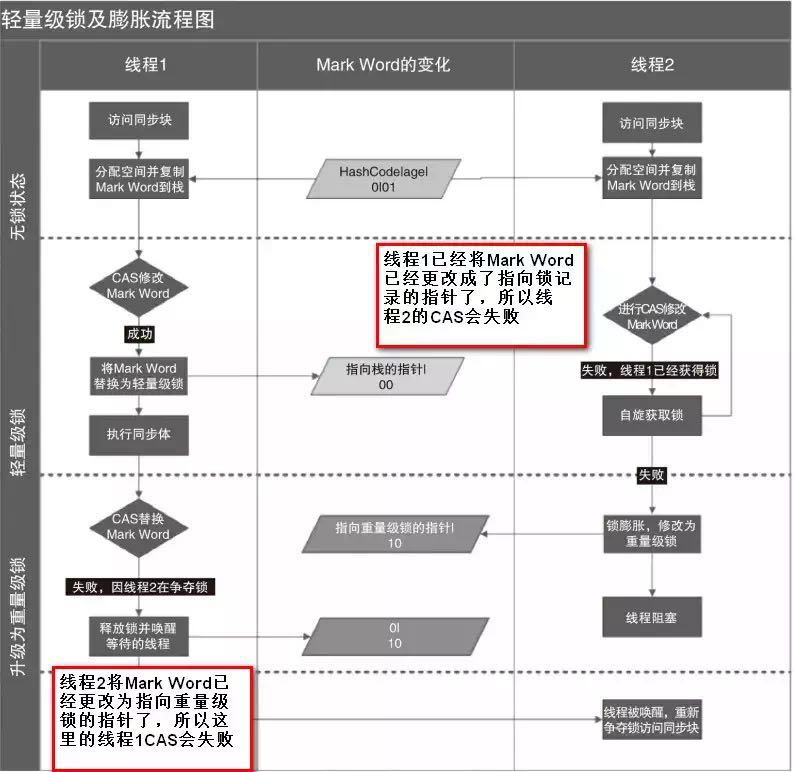 轻量级解锁时,会使用原子的CAS操作将Displaced Mark Word替换回到对象头,如果成功,则表示没有竞争发生。如果失败,表示当前锁存在竞争,锁就会膨胀成重量级锁。下图是两个线程同时争夺锁,导致锁膨胀的流程图。