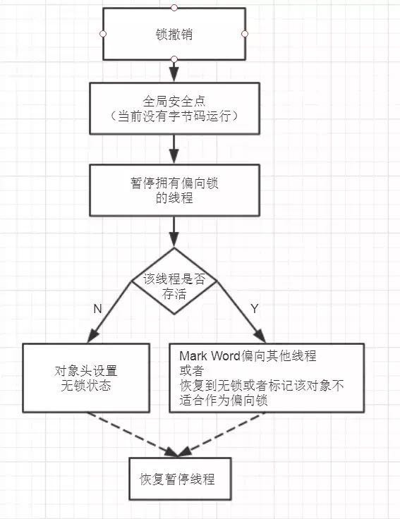 如图,偏向锁的撤销,需要等待全局安全点(在这个时间点上没有正在执行的字节码)。它会首先暂停拥有偏向锁的线程,然后检查持有偏向锁的线程是否活着,如果线程不处于活动状态,则将对象头设置成无锁状态;