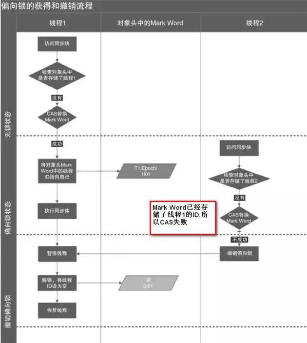 下图线程1展示了偏向锁获取的过程,线程2展示了偏向锁撤销的过程。