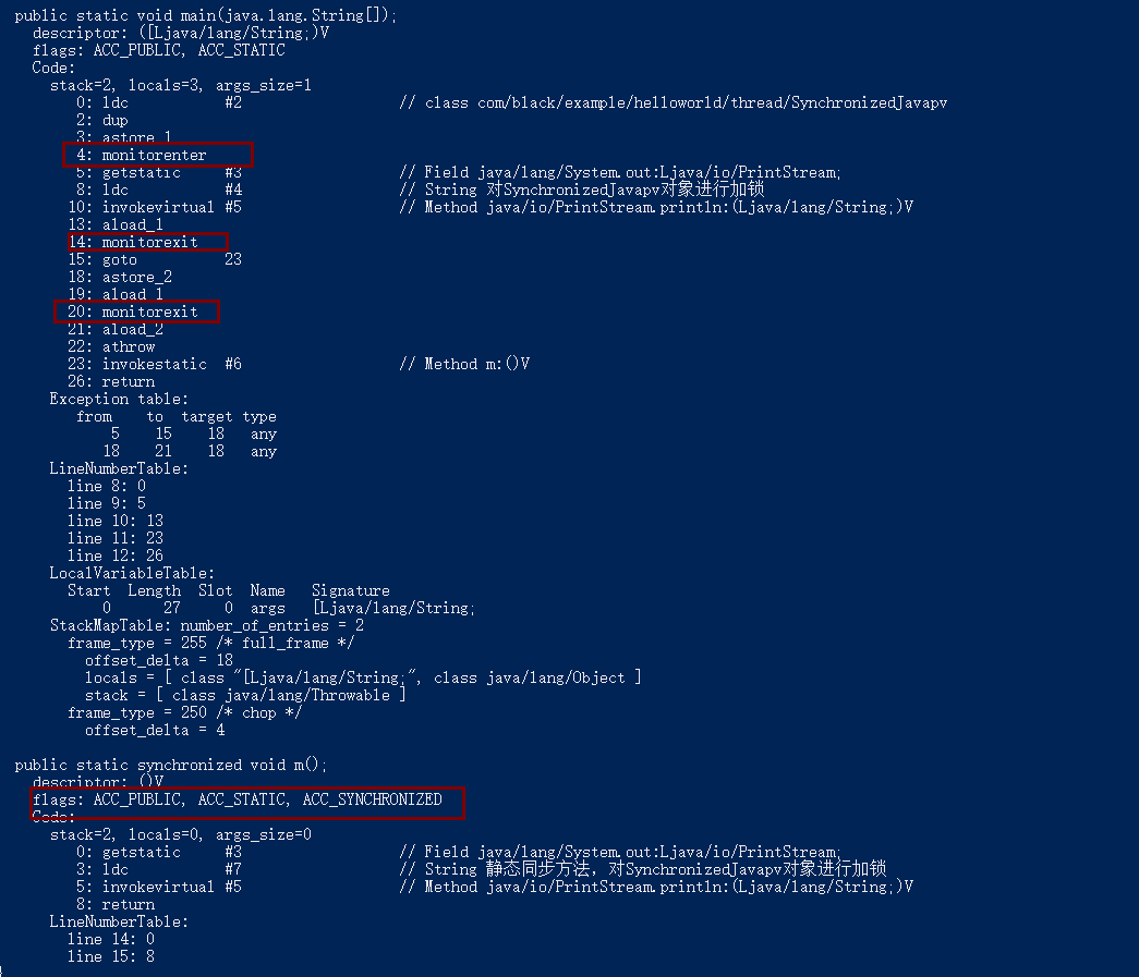 public class SynchronizedJavapv { public static void main(String[] args) { synchronized (SynchronizedJavapv.class){ System.out.println("对SynchronizedJavapv对象进行加锁"); } m(); } public static synchronized void m(){ System.out.println("静态同步方法,对SynchronizedJavapv对象进行加锁"); } }编译之后,切换到SynchronizedJavapv.class的同级目录之后,然后用javap -v SynchronizedJavapv.class查看字节码文件,分析实现细节: