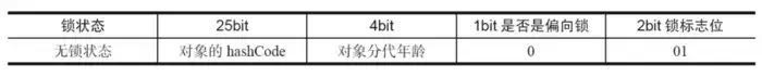 在同步的时候是获取对象的monitor,即获取到对象的锁。那么对象的锁怎么理解?无非就是类似对对象的一个标志,那么这个标志就是存放在Java对象的对象头。Java对象头里的Mark Word里默认的存放的对象的Hashcode,分代年龄和锁标记位。32为JVM Mark Word默认存储结构为(注:java对象头以及下面的锁状态变化摘自《java并发编程的艺术》一书,该书我认为写的足够好,就没在自己组织语言班门弄斧了):