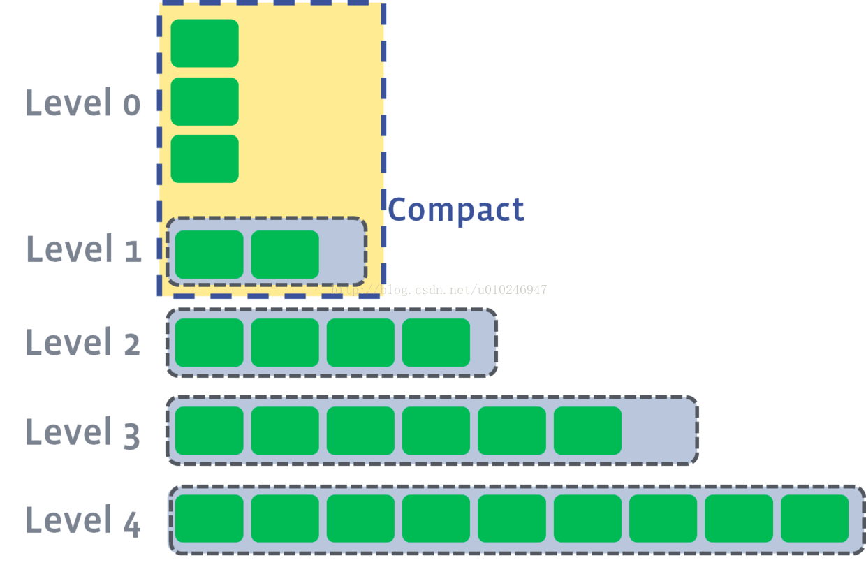 3、落盘后的各级文件,也会定期进行排序加合并(compact),合并后数据进入下一层level;