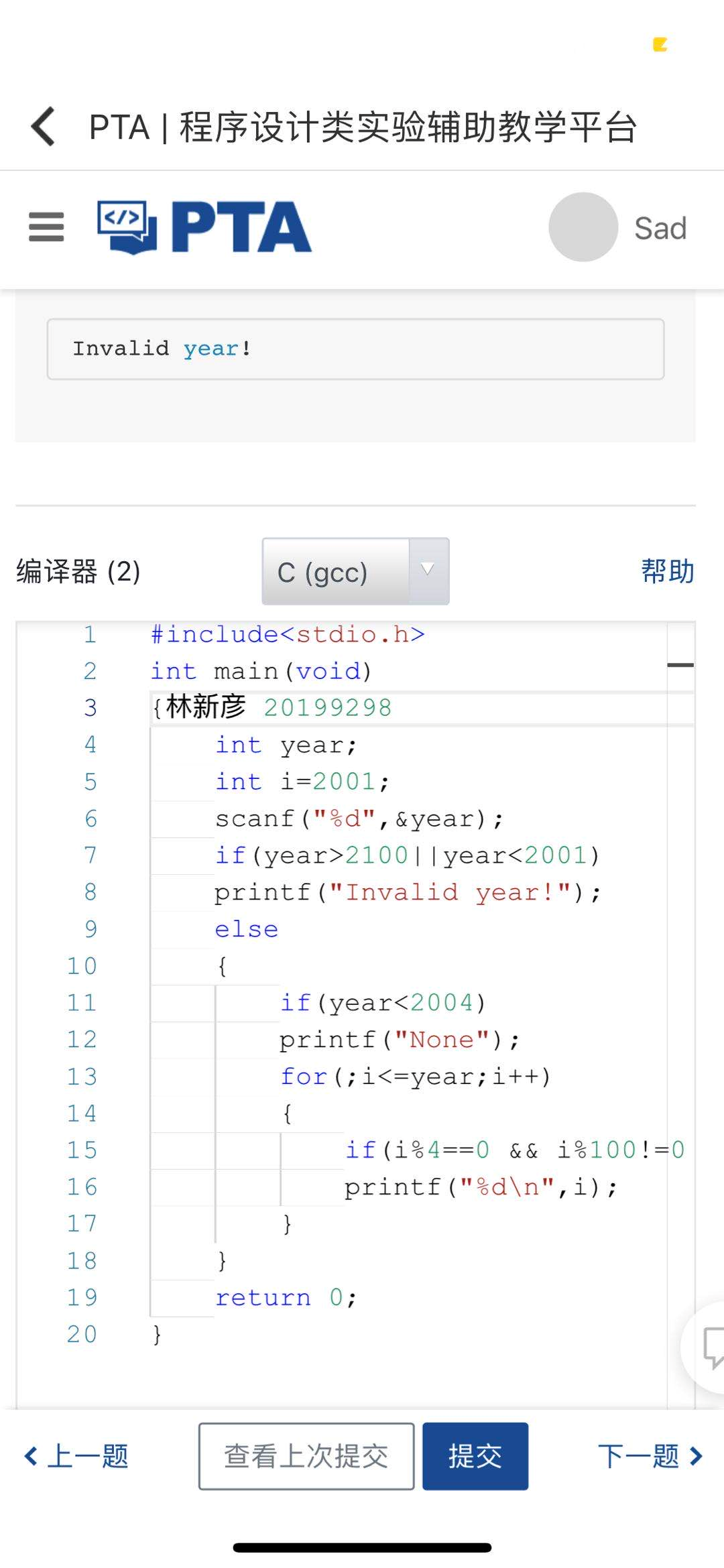 内容描述:输出21世纪中截止某个年份以来的所有闰年年份。注意:闰年的判别条件是该年年份能被4整除但不能被100整除、或者能被400整除。