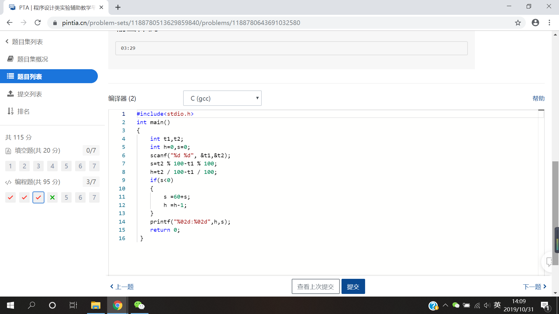 | 3/9~3/15 | 两个小时 | 91 | 重新复习了if-else的表达方式 | 写代码过程中一直出现忽略scanf的返回值是什么意思 |