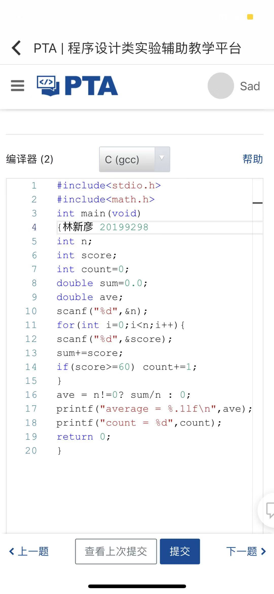 答案错误:数学语言没用对,加了一句a = n!=0? sum/n : 0;