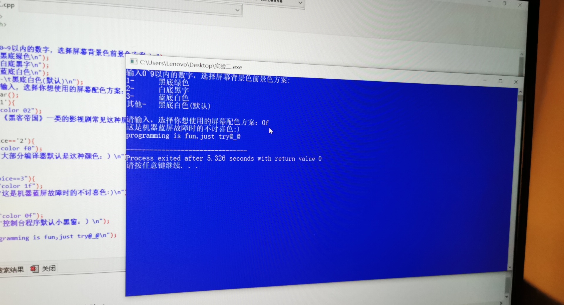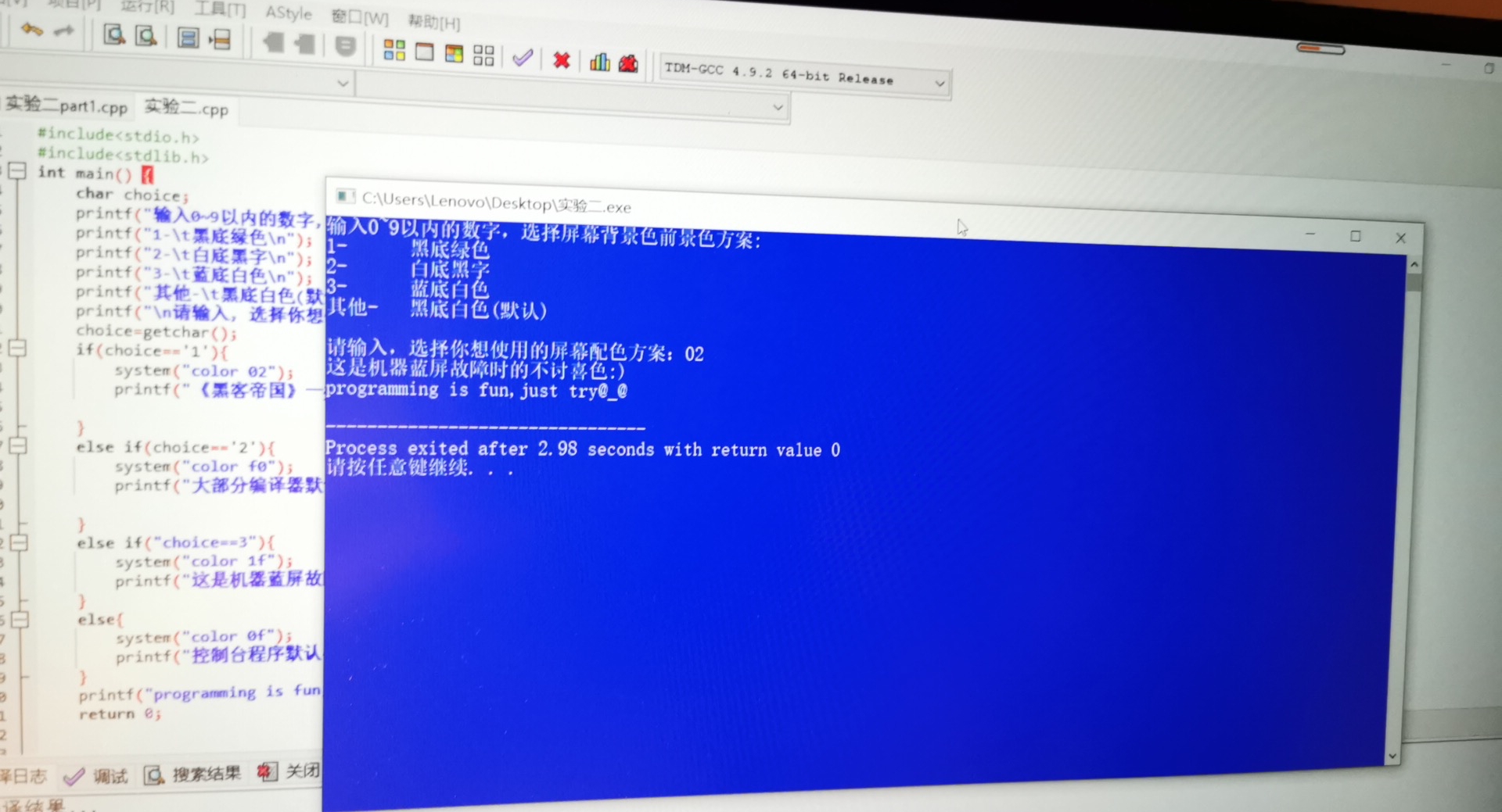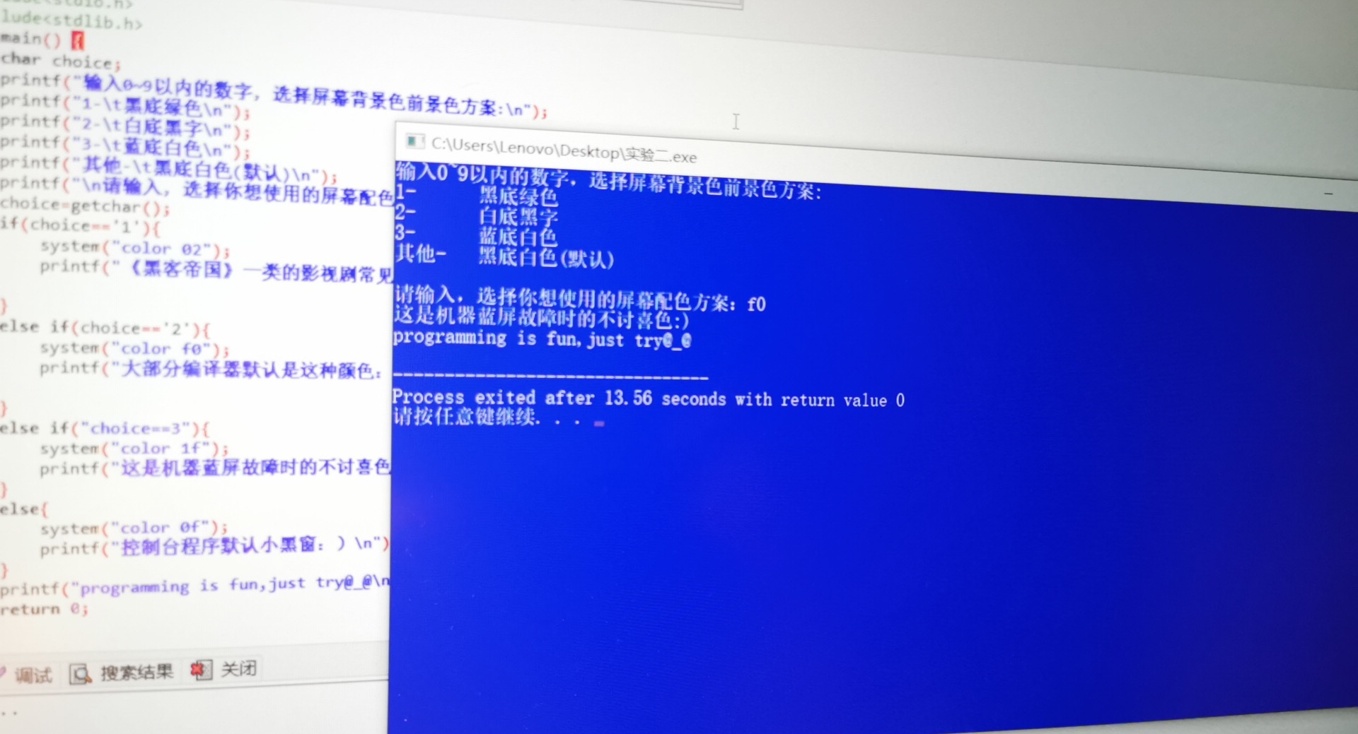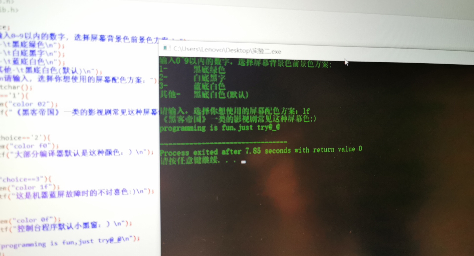 printf("输入0~9以内的数字,选择屏幕背景色前景色方案:\n");