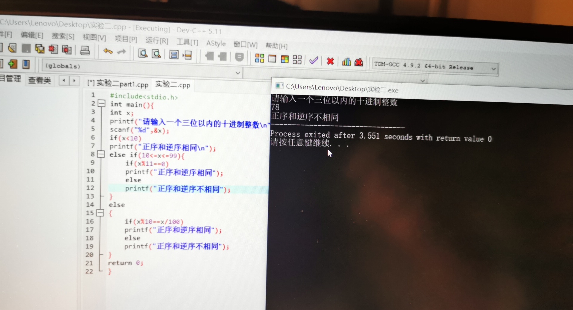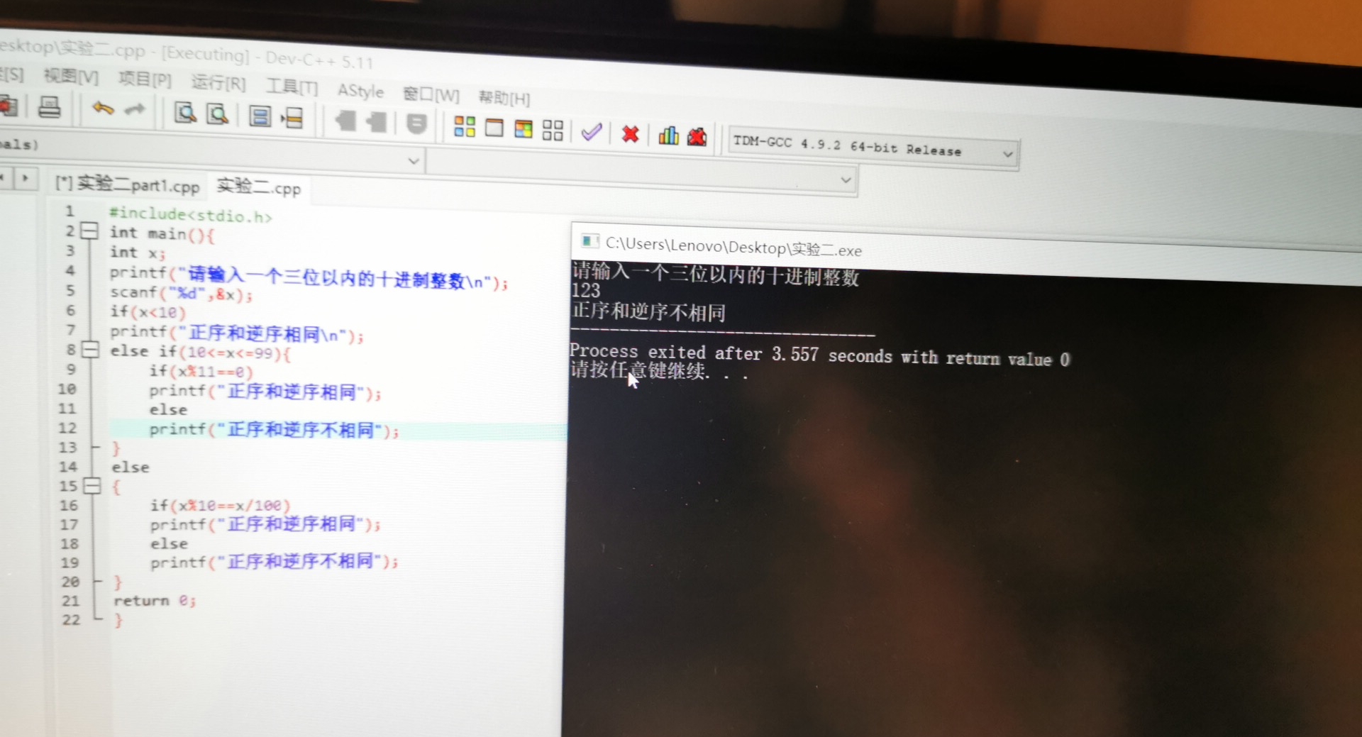 printf("正序和逆序不相同");