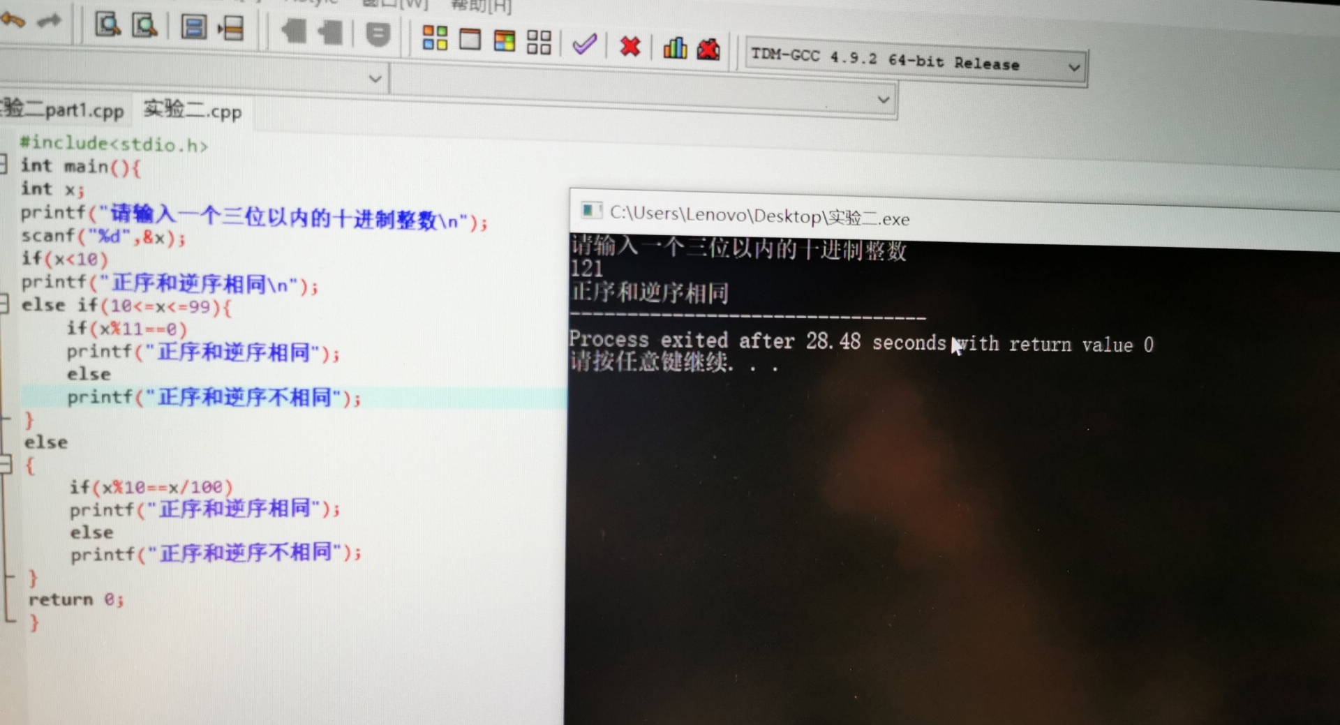 printf("正序和逆序相同\n");