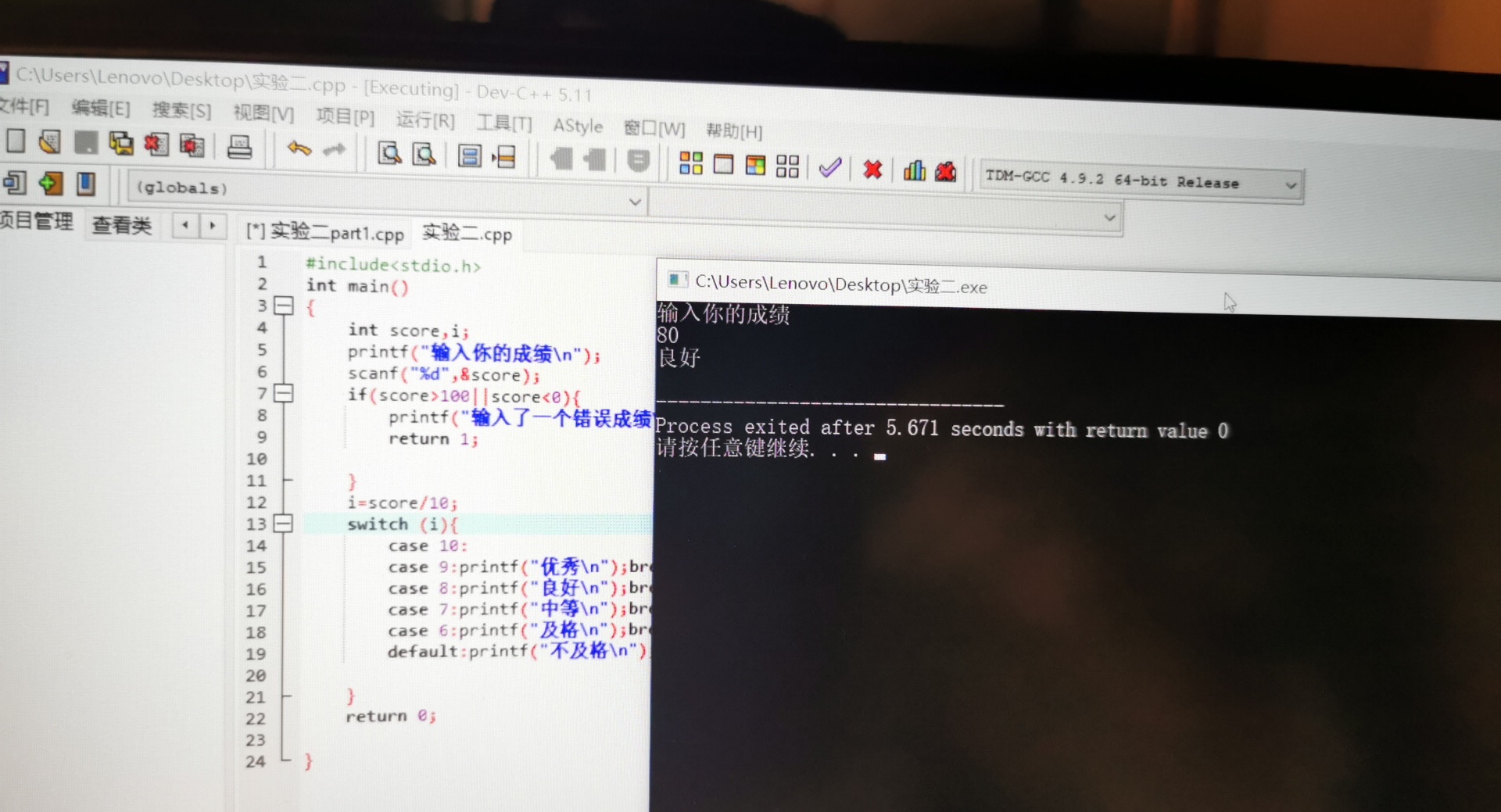 printf("输入你的成绩\n");