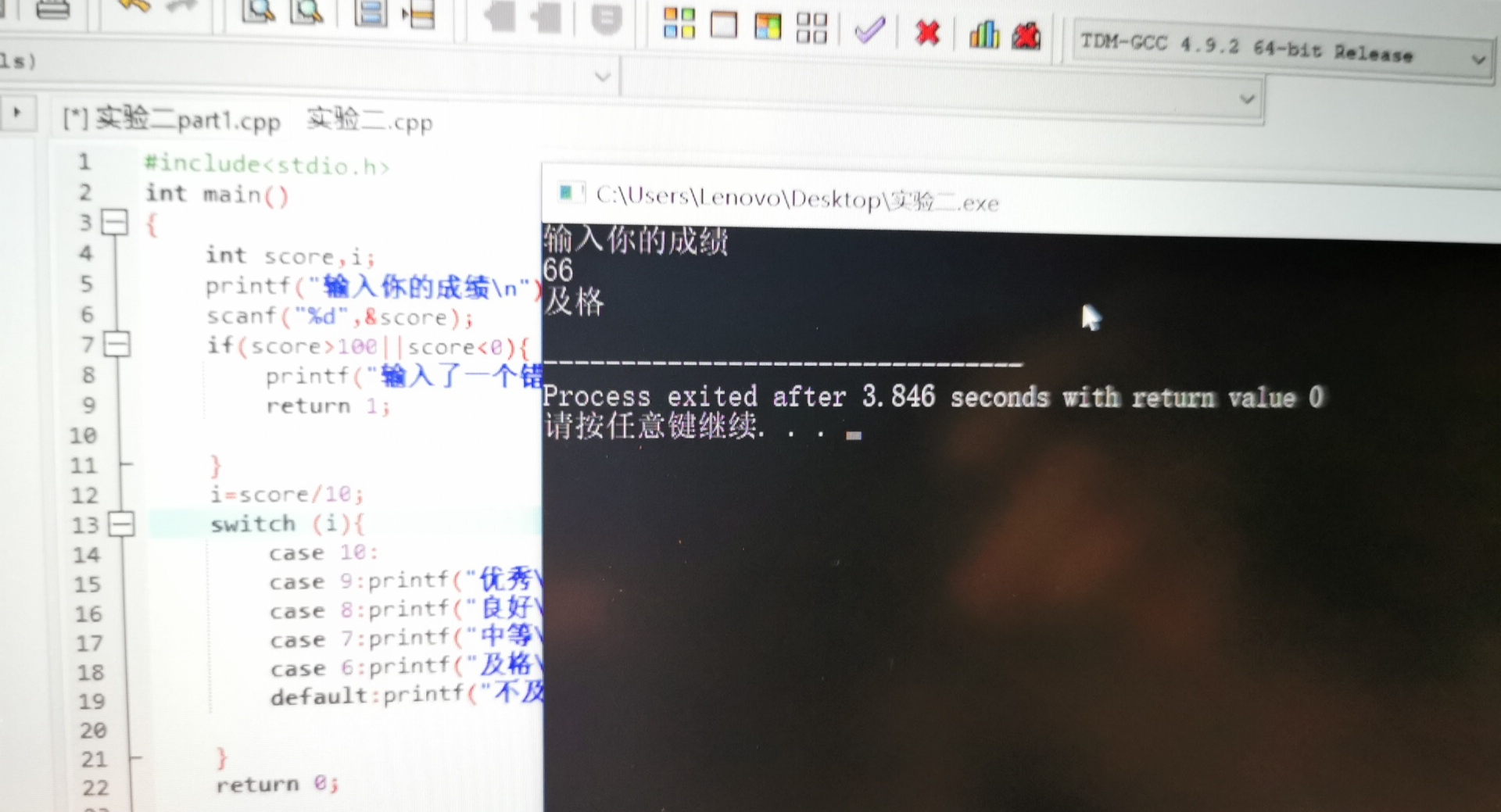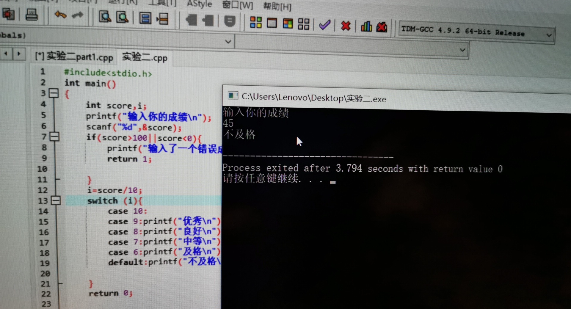 printf("输入了一个错误成绩\n");