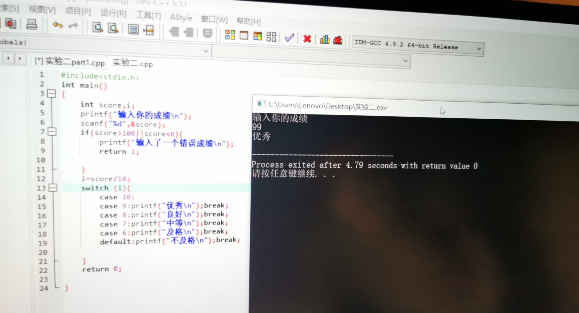case 9:printf("优秀\n");break;