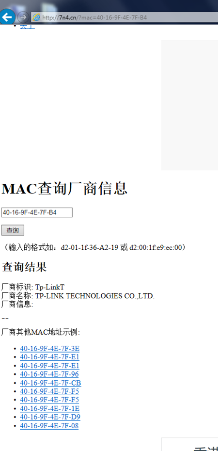在一个案件中,获取了犯罪嫌疑人的一个MAC地址:40-16-9F-4E-7F-B4,请查询该MAC地址对应的厂商是(附截图)