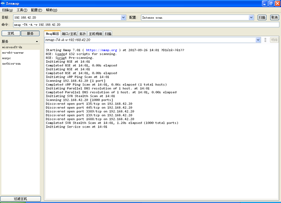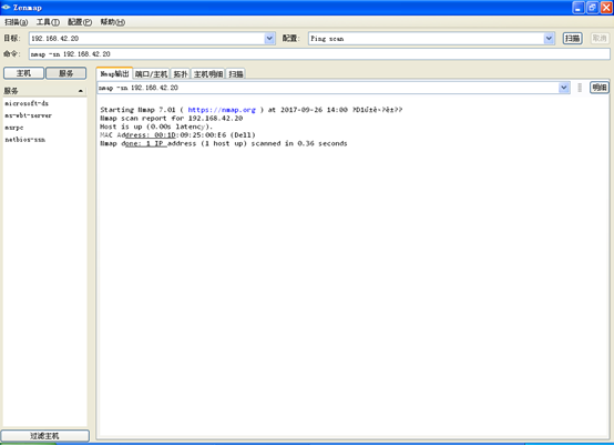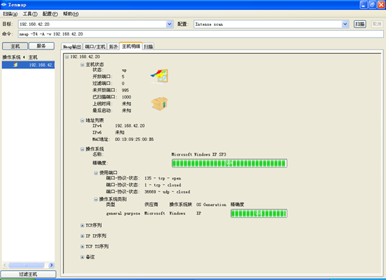 选择一个存活IP地址,扫描所开放的端口(分别用ping扫描,syn扫描尝试),并查询常用端口所对应的服务及操作系统信息。