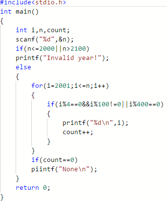 输出21世纪中截止某个年份以来的所有闰年年份。注意:闰年的判别条件是该年年份能被4整除但不能被100整除、或者能被400整除。