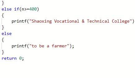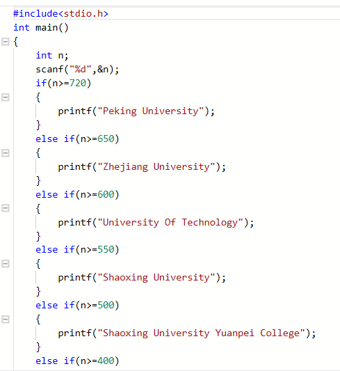 高考结束不久,各校的入取分数线也出来了,北京大学(Peking University)720,浙江大学(Zhejiang University)650,工业大学(University Of Technology)600,文理学院(Shaoxing University)550,文理学院元培学院(Shaoxing University Yuanpei College)500,绍兴职业技术学院(Shaoxing Vocational & Technical College)400,张三的分数为n,请问张三能去哪个大学? 如果分数低于400,则回家种地(to be a farmer)。很多学生都想知道自己能去哪个学校,求身为程序员的你帮帮他们。