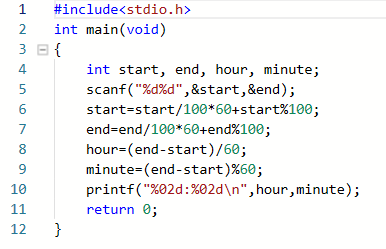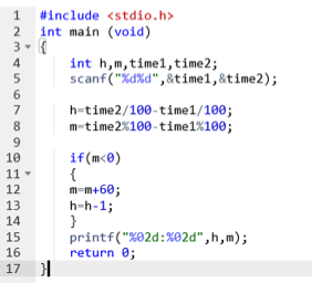 输入在一行中给出2个4位正整数,其间以空格分隔,分别表示火车的出发时间和到达时间。每个时间的格式为2位小时数(00-23)和2位分钟数(00-59),假设出发和到达在同一天内。