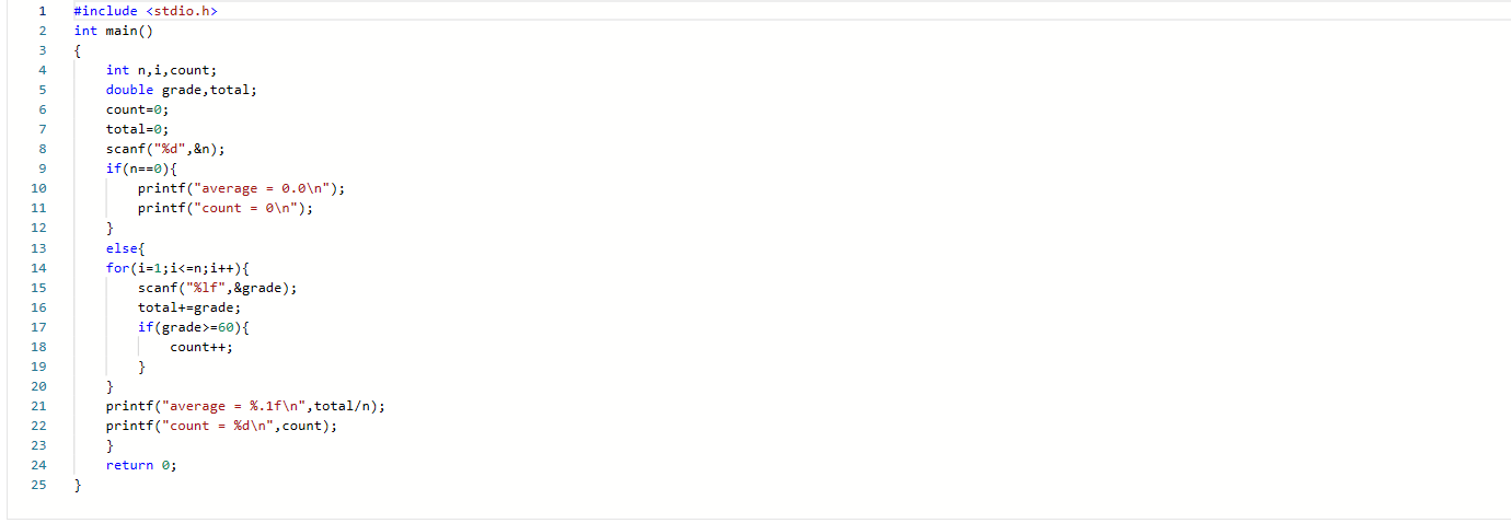 要求编写程序,计算学生们的平均成绩,并统计及格(成绩不低于60分)的人数。题目保证输入与输出均在整型范围内.。