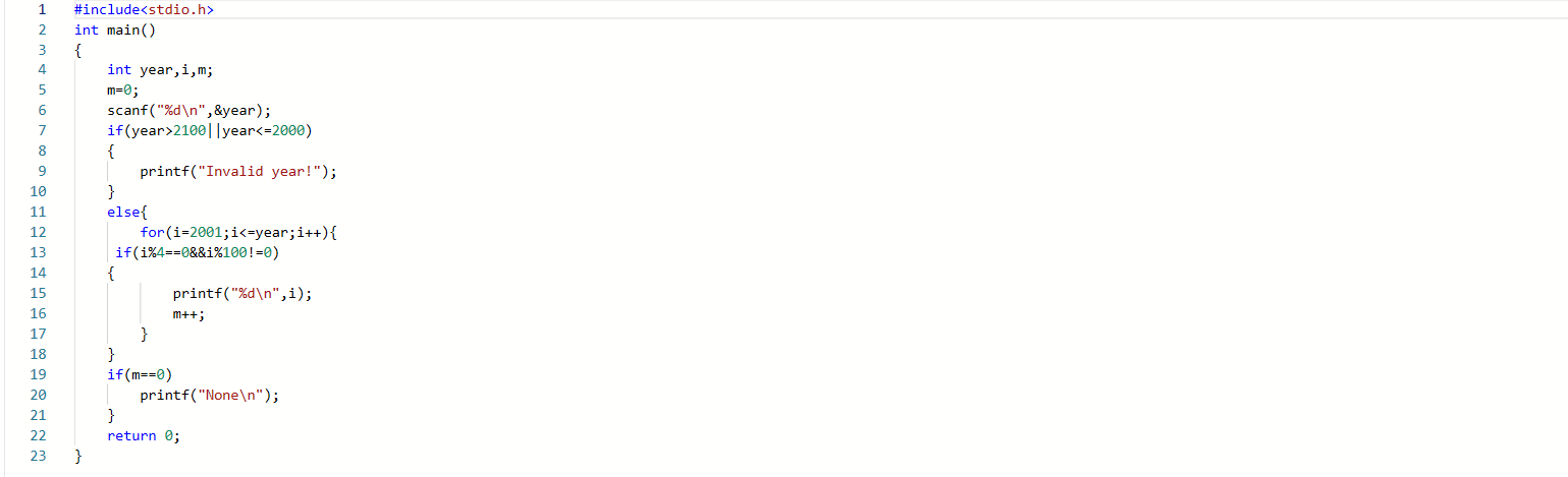 1.题目内容描述:输出21世纪中截止某个年份以来的所有闰年年份。注意:闰年的判别条件是该年年份能被4整除但不能被100整除、或者能被400整除。