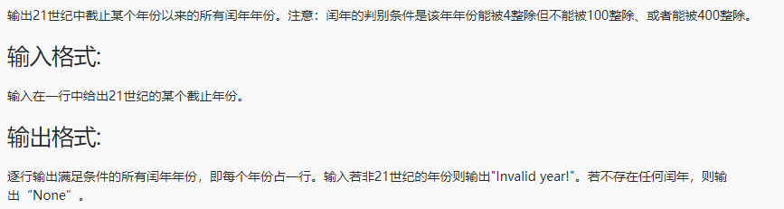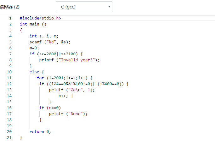 数据处理:用到主要表达式为(i%4==0&&i%100!=0)||(i%400==0),开始输入s,i,m,判断s是否在2000-2100之间,若是则进入i%4==0&&i%100!=0)||(i%400==0输出i。若没有闰年自输出None。