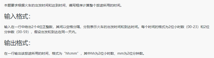 数据表达:定义了h,m,a,b等整型变量,a,b分别指出发时间和到达时间,h,m分别表示小时和分钟,以hh:mm的形式输出。