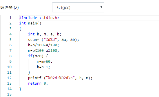 数据处理:用到主要表达式为h=b/100-a/100; m=b%100-a%100,开始输入a,b,把h,m分别用表达式写出,若m<0,则m+60,h-1,最后输出hh:mm。