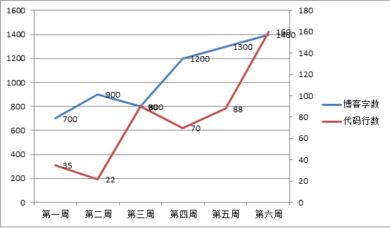 周/日期 这周所花的时间 代码行 学到的知识点简介 目前比较迷惑的问题 3/10 8-10 11 12h 90 4/10 15-10 18 20h 70 学会了for语句,对整体也更加了解 double和int还是有点分不清 5/10 22-10 26 15h 88 学会了调用一个自定义函数 对自定义函数的概念还很模糊 6/10 29-11 02 20h 160 这周学会了if-else,switch等多分支语句 switch语句还是不太会用 3.2 累积代码行和博客字数