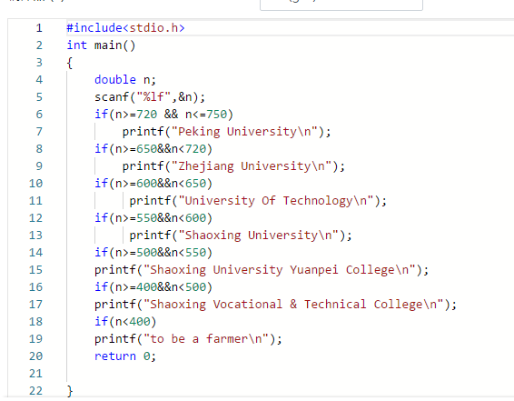 高考结束不久,各校的入取分数线也出来了,北京大学(Peking University)720,浙江大学(Zhejiang University)650,工业大学(University Of Technology)600,文理学院(Shaoxing University)550,文理学院元培学院(Shaoxing University Yuanpei College)500,绍兴职业技术学院(Shaoxing Vocational & Technical College)400,张三的分数为n,请问张三能去哪个大学? 如果分数低于400,则回家种地(to be a farmer)。很多学生都想知道自己能去哪个学校,求身为程序员的你帮帮他们。