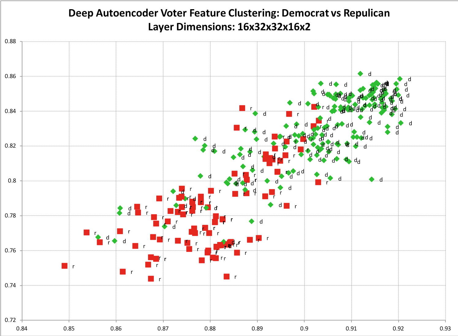 The second command there extracts the hidden node weights. f is a data frame, with two numeric columns, and one row for every row in the tfidf source data. I chose just two hidden nodes so that I could plot the clusters: