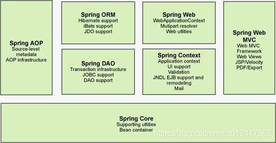 在分析Spring源码之前想必大家对Spring的功能使用应该是比较熟悉了,让我们先看看Spring的各个功能模块,让大家对Spring还是有个整体概念: