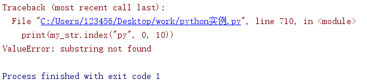 在index()方法中,刚刚我们讲了str在my_str中的情况,假如我们要查找的str不在my_str中的时候,会怎么样呢?接下来我们来时机演示一下: